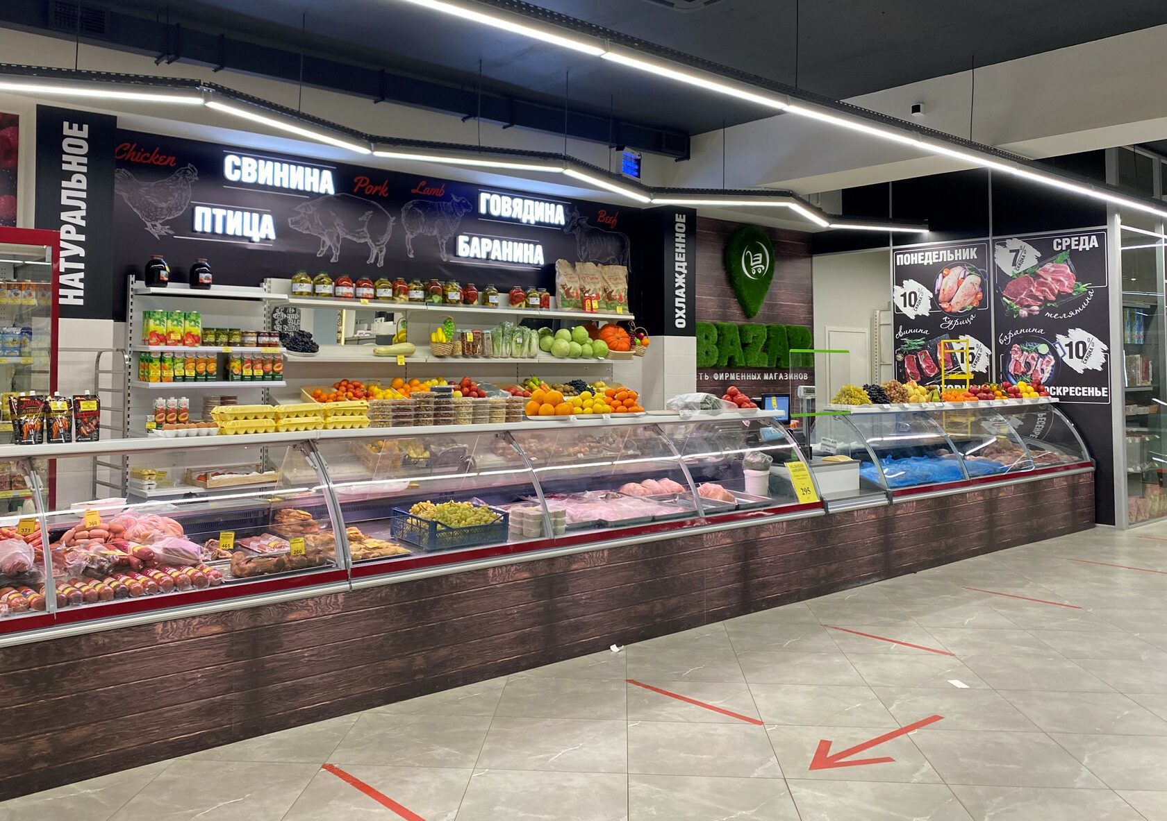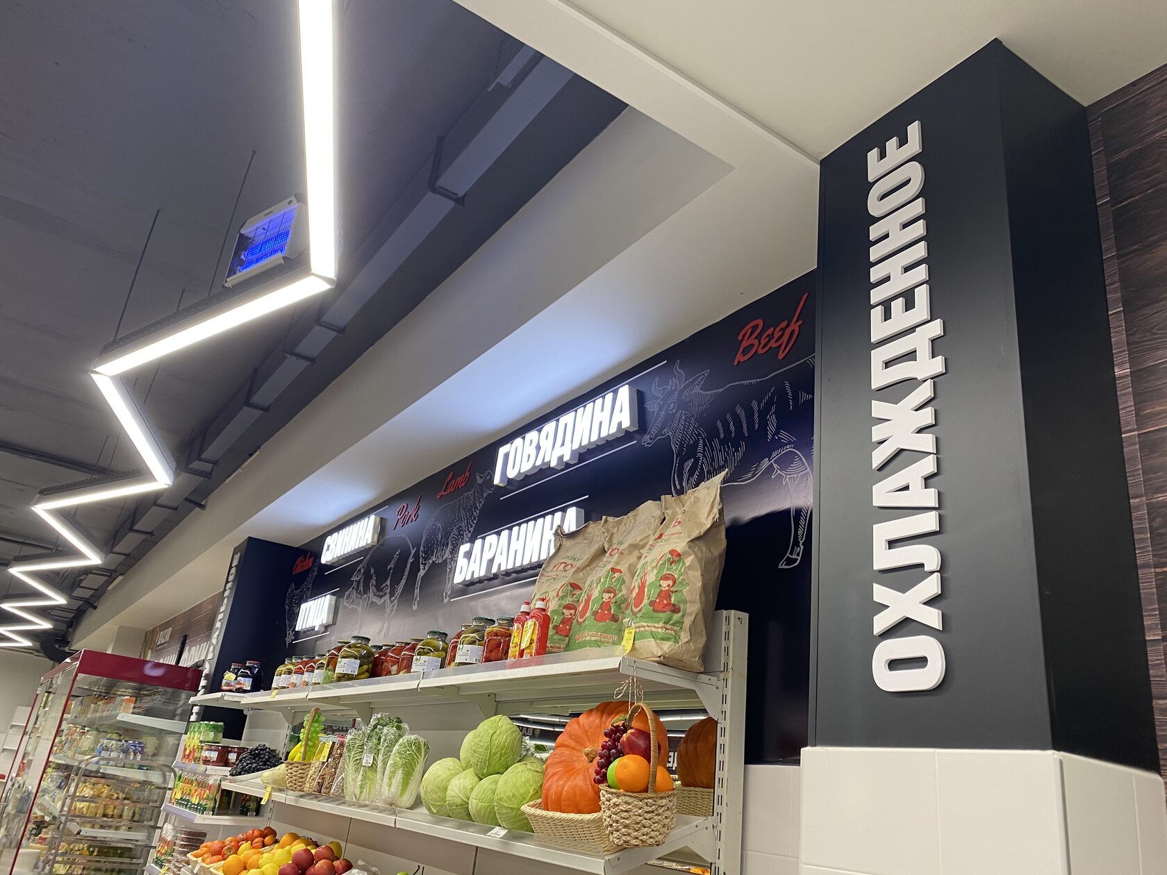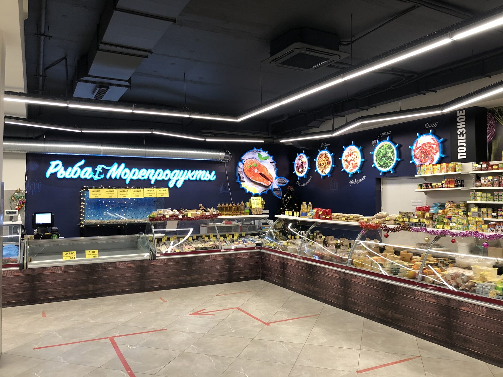 Фоновая часть всего угла, который занял рыбный отдел затянута баннером 360 гр. с изображением 1440 dpi и натянута на установленный каркас. По правой стороне стены поверх баннера смонтированы объемные фигурные световые короба, которые оклеены пленкой ORAJET с отпечатанным изображением способом УФ-печать, в совокупности с подсветкой такой метод даёт сочную и яркую цветопередачу графики. По левой стороне расположилось название «Рыба&Морепродукты» изготовлено способом светового фигурного короба и состоит из двух частей.