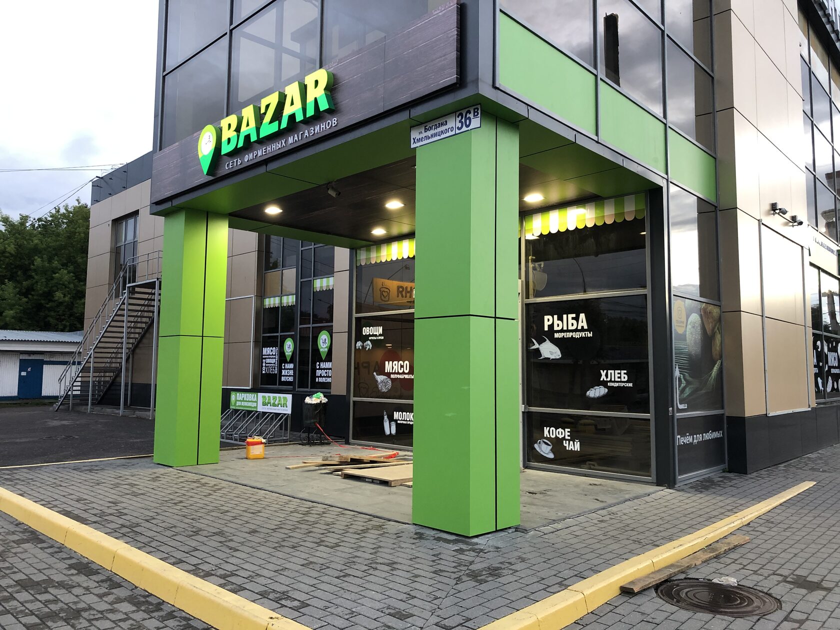 Разработка логотипа, дизайн-проекта, изготовление и монтаж входной группы, а также внутреннего оформления магазина.