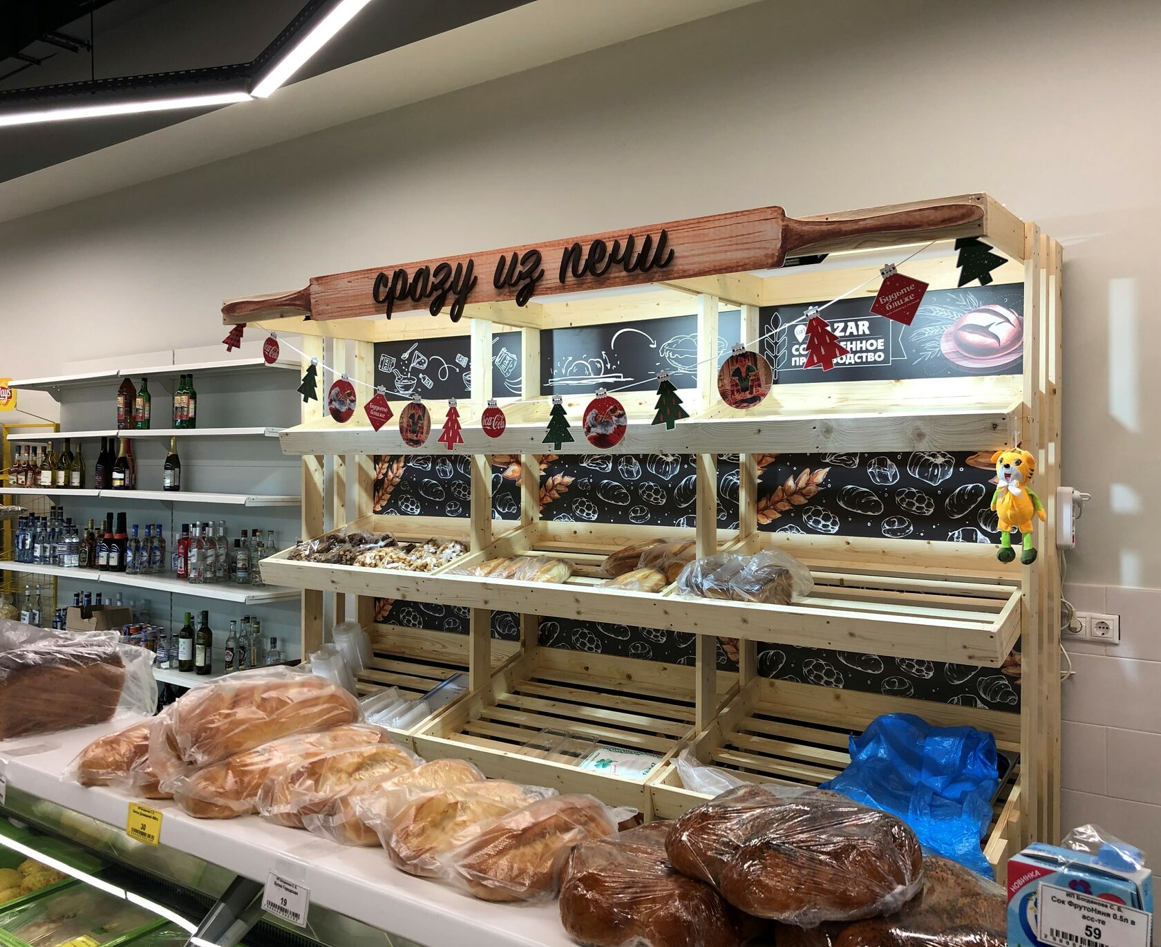 Во внутреннюю часть стеллажа установлены элементы из ПВХ 3 мм оклеенные пленкой ORAJET с отпечатанным изображением способом УФ-печать. На верху смонтирован элемент в виде "скалки" выполненный из ПВХ 5 мм с отпечатанным изображением на плёнке ORAJET и объемные несветовые буквы из ПВХ 8 мм.