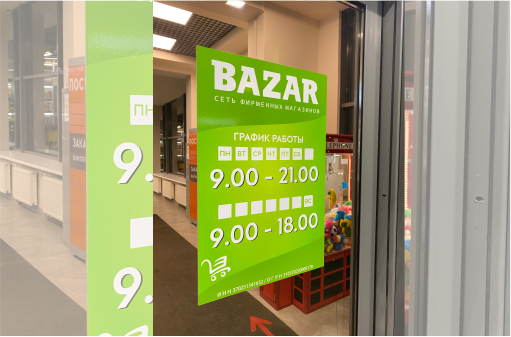 Над входом установлен световой короб из зелёного акрилового оргстекла PLEXIGLAS 3 мм с акриловыми белыми буквами PLEXIGLAS 3 мм поверх короба и оклеен прозрачной пленкой ORAJET с отпечатанным изображением, способом УФ-печать. На витражных стёклах размещены вырубные надписи, а так же графические элементы, отпечатанные УФ-печатью на прозрачной пленки ORAJET.