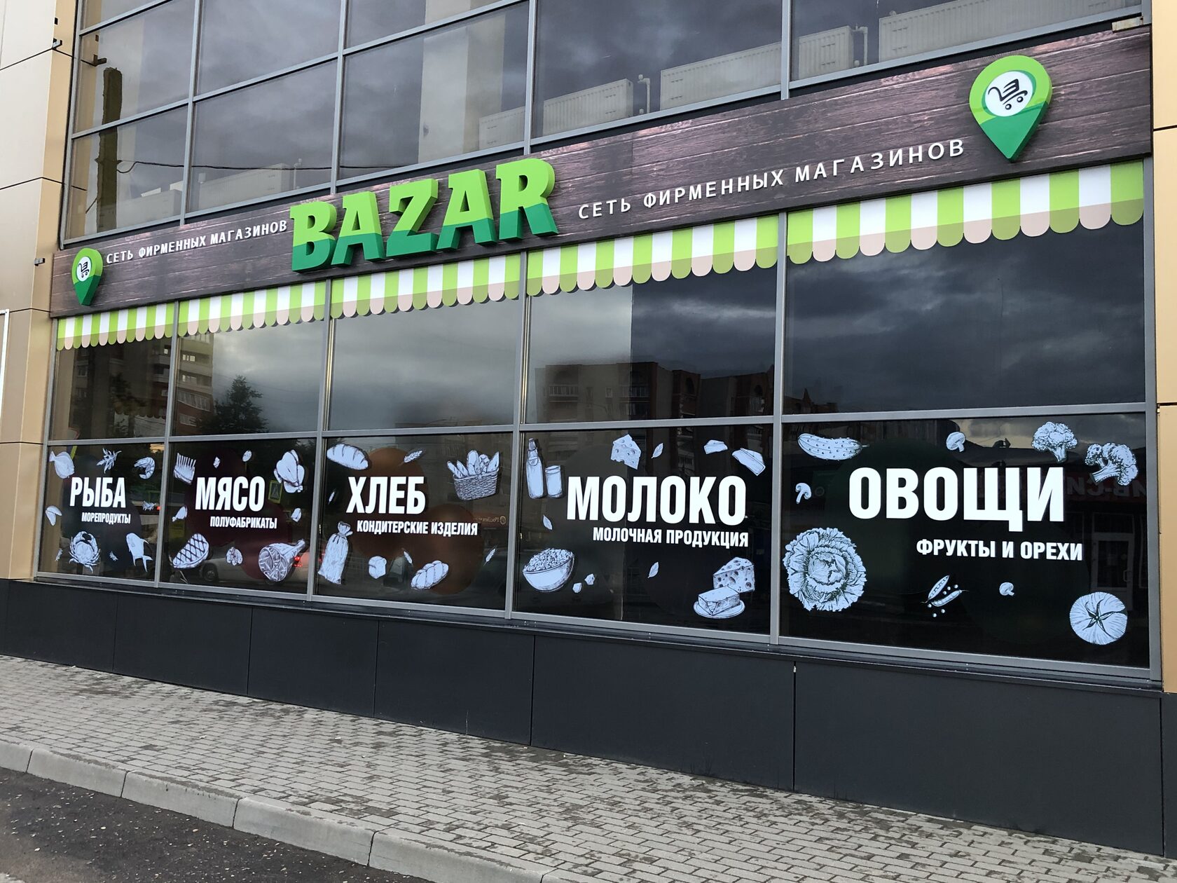 Фоновая часть над стеллажами выполнена на баннер 360 гр. изображением 1440 dpi. Поверх установлены объемные световые буквы, не имеющие общего каркаса, каждая из которых устанавливается отдельно (один из самых сложных вариантов монтажа), а так же сопровождающие надписи из красного акрилового оргстекла. Боковая часть стёкл оклеена пленкой ORAJETс отпечатанным на ней изображением об "акционных днях", печать с двойной заливкой для придания насыщенности.
