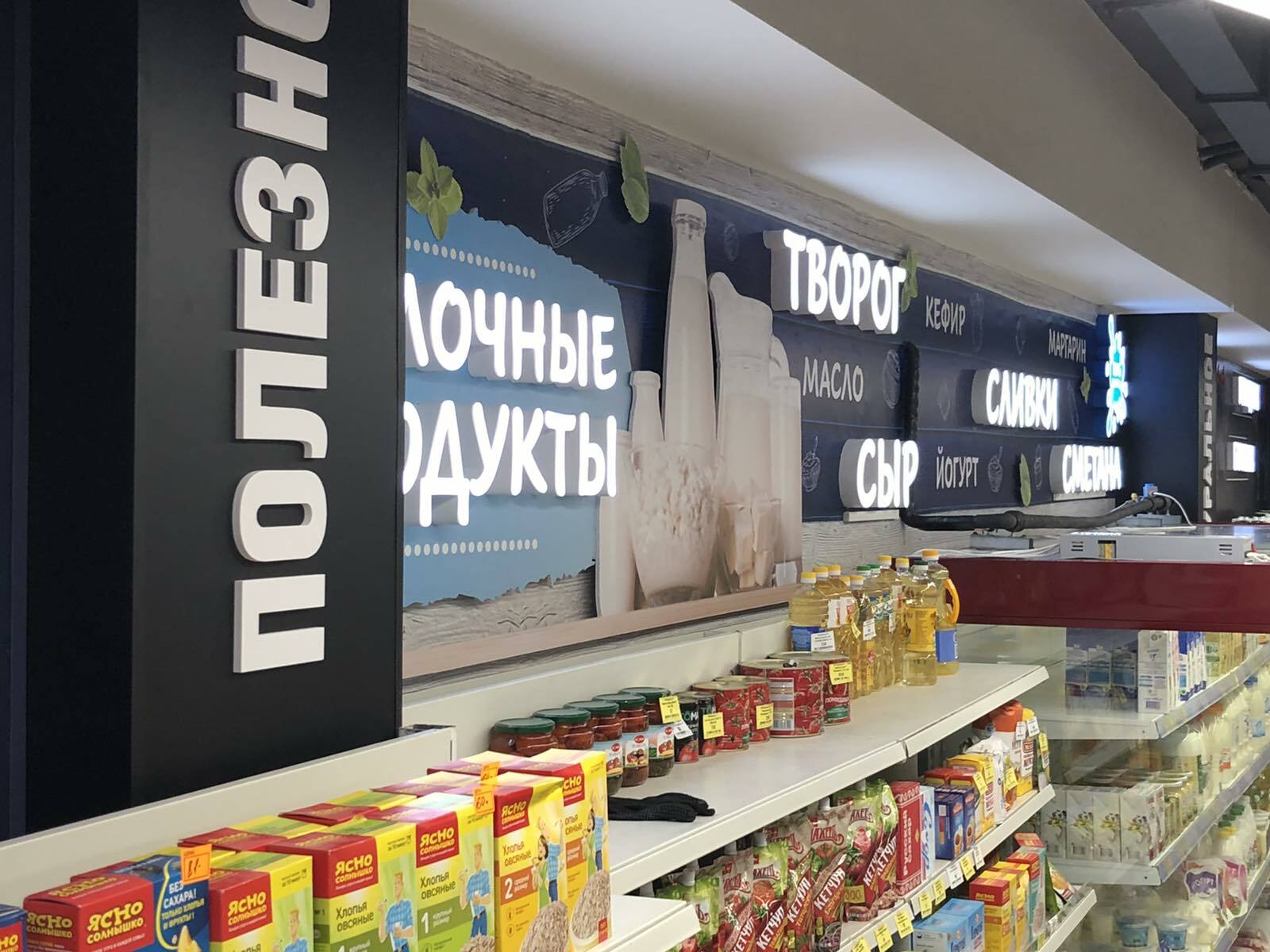 Фоновая часть над стеллажами выполнена на баннер 360 гр. с изображением 1440 dpi. Поверх установлены объемные световые буквы, не имеющие общего каркаса, каждая из которых устанавливается отдельно (один из самых сложных вариантов монтажа) и световой фигурный короб. Так же на дистанционных держателях смонтированы не световые декоративные элементы из ПВХ 5 мм оклеенная поверх плёнкой ORAJET с отпечатанным на ней изображением "молочная продукция" и "листочки"