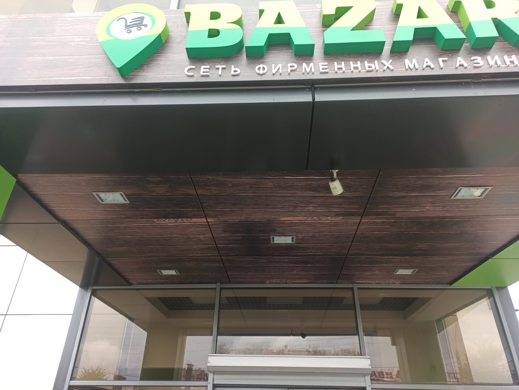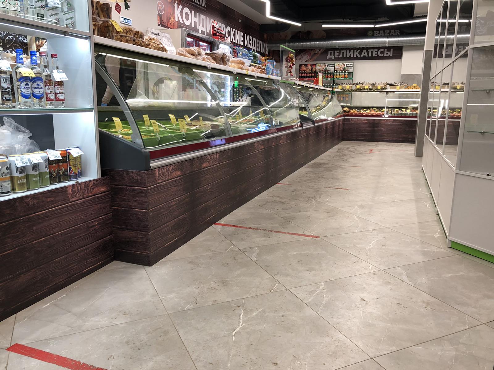 Нижняя часть витрин оформлена с помощью панелей из ПВХ 5 мм оклеенный пленкой ORAJET с отпечатанным изображением "тиснение древесины" способом УФ-печать в единой концепции со всем магазином. И придания дополнительно комфорта прибывания в помещении.