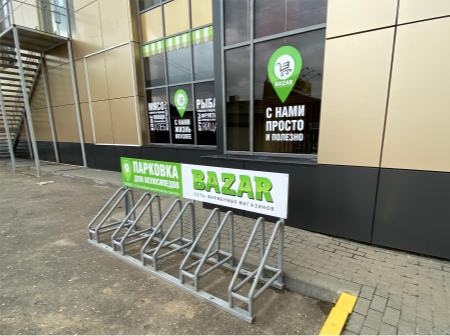 На окнах размещены слова технологией вырубных букв, а так же логотип компании и фирменный элемент "маркизы" отпечатанные УФ-печатью на плёнке ORAJET. Смонтирована табличка для велосипедной парковки из композитного материала типа Алюкобонд оклеенная пленкой ORAJET с отпечатанным на ней изображением способом УФ-печать.