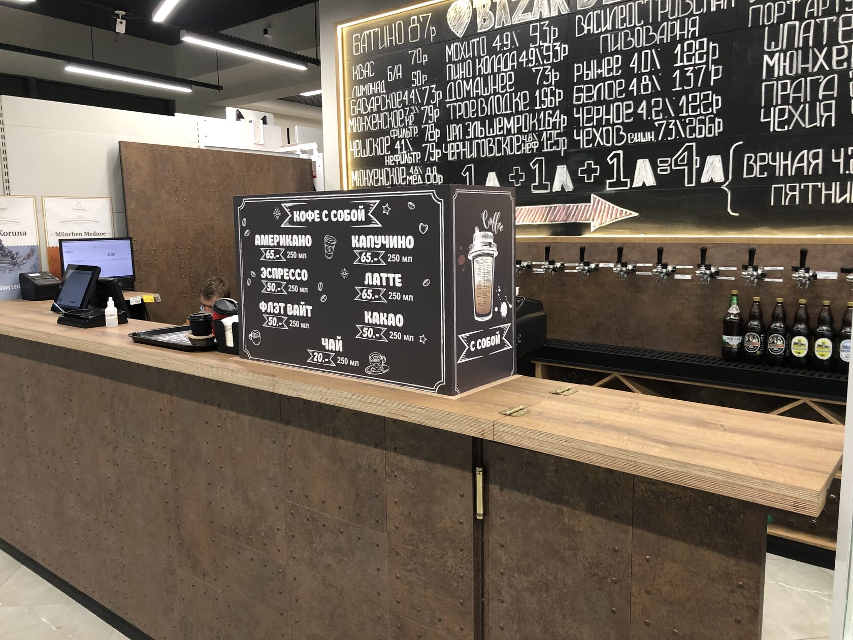Разработана, изготовление и смонтирована небольшая кофейная стойка-меню для кофе на вынос с собой. Материал ПВХ 5 мм оклеенные пленкой ORAJET с отпечатанным изображением способом УФ-печать.