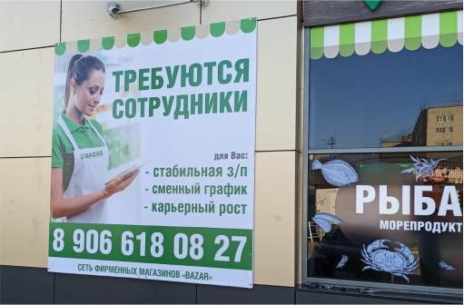 С торца здания на железном каркасе установили баннер "о поиске сотрудников". *Уточняем, что постоянное размещение баннеров в соответствии с дизайн-кодом города ЗАПРЕЩЕННО.