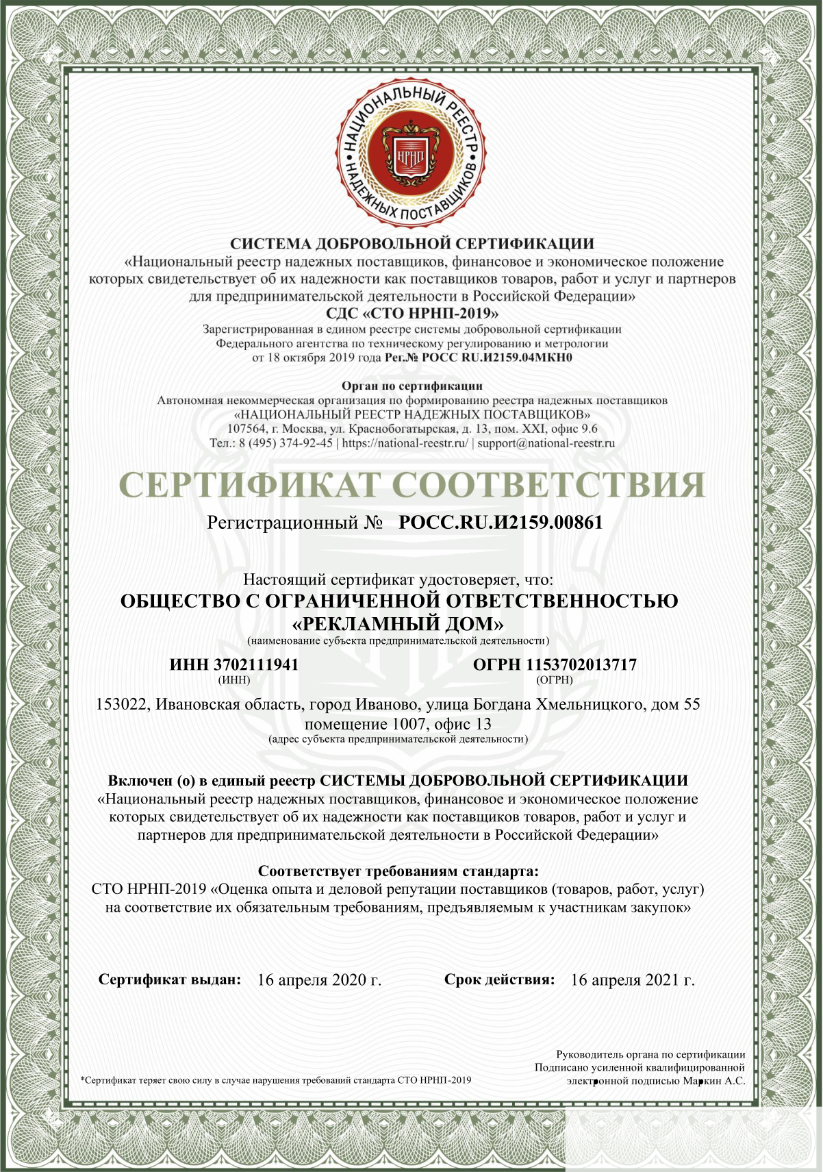 Компания включена в "Федеральный реестр добросовестных поставщиков", что подтверждается сертификатами: