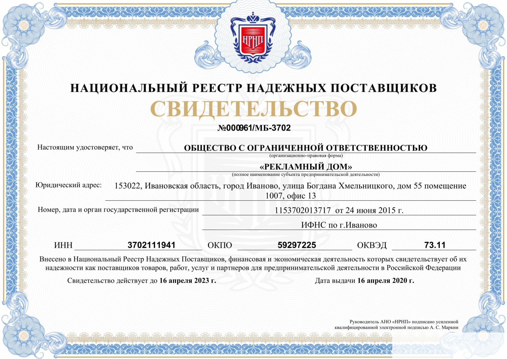 Рекламно-производственная компания «Рекламный Дом» с 2015 год на рынке рекламы. Мы оказываем полный спектр изготовления наружной и интерьерной рекламы, от табличек и постеров до вывесок и крышных установок, в том числе и согласование. За это время мы выбрали только качественные комплектующие и самых надежных поставщиков материалов. Это позволяет давать гарантию на наши услуги 3 года. Существует огромное количество технологий изготовления Вашей рекламы. На сайте мы разместили основные виды, но всегда готовы сделать для Вас что-то эксклюзивное.