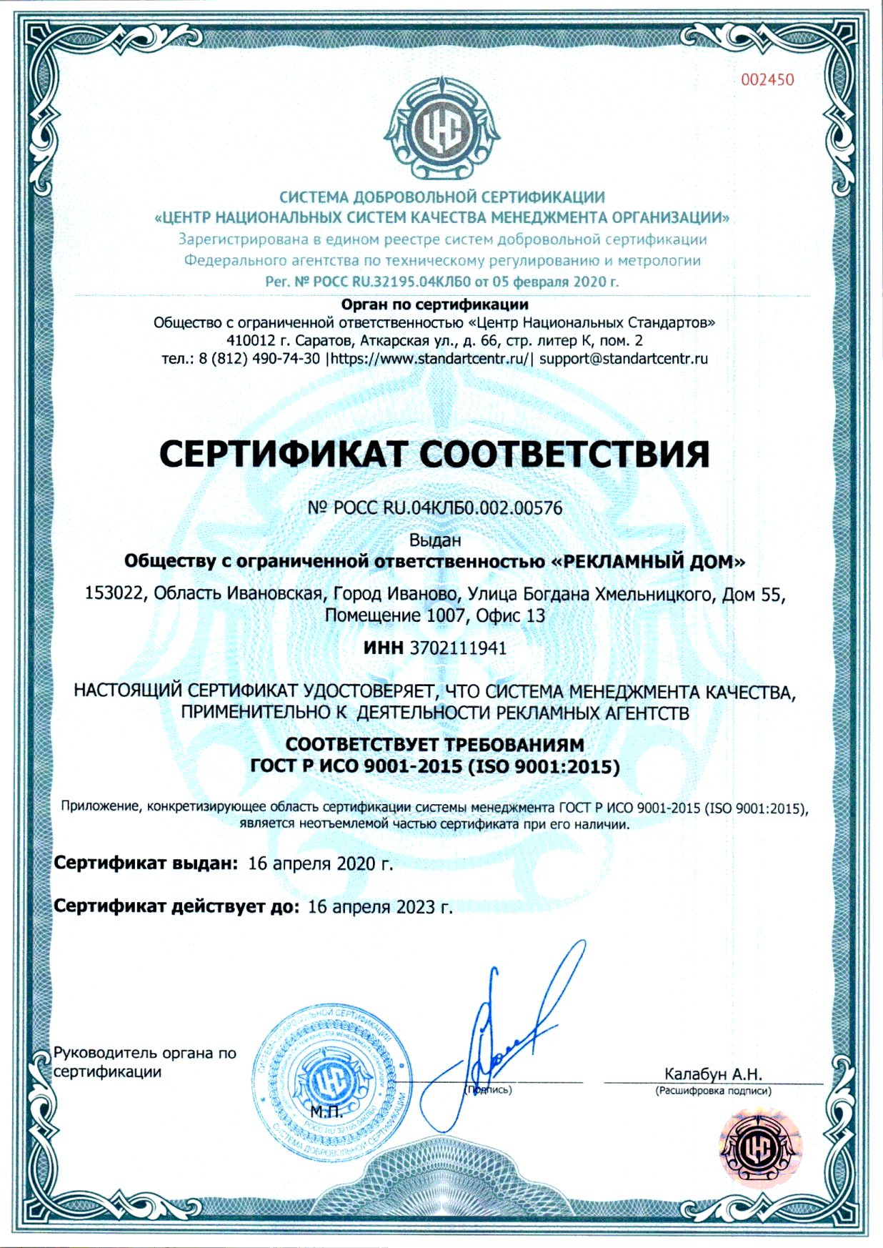 Мы уверены в отличном качестве изготавливаемой продукции, поэтому предлагаем гарантию до 3-х лет на все виды рекламы.